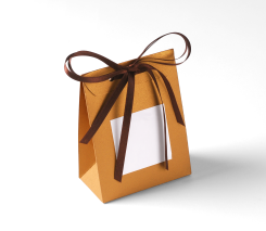 Bolsita para regalo de cartón, de forma piramidal y pequeñas dimensiones. Resulta perfecta para bombones, caramelos o pequeños objetos. Por su facilidad de montaje, se puede utilizar como envoltorio de regalo en tiendas.